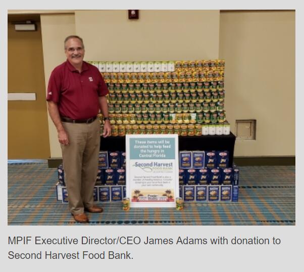 After the event, the food items were donated to the local charity, Second Harvest Food Bank. Second Harvest Food Bank of Central Florida collects, inventories, and distributes donated food to more than 550 feeding partners in six Central Florida counties. The food bank has distributed millions of meals to partner programs such as food pantries, soup kitchens, women's shelters, senior centers, day care centers and Kids Cafes. In total MPIF donated over 500 canned goods and more than 100 boxes of non-perishable food items.
