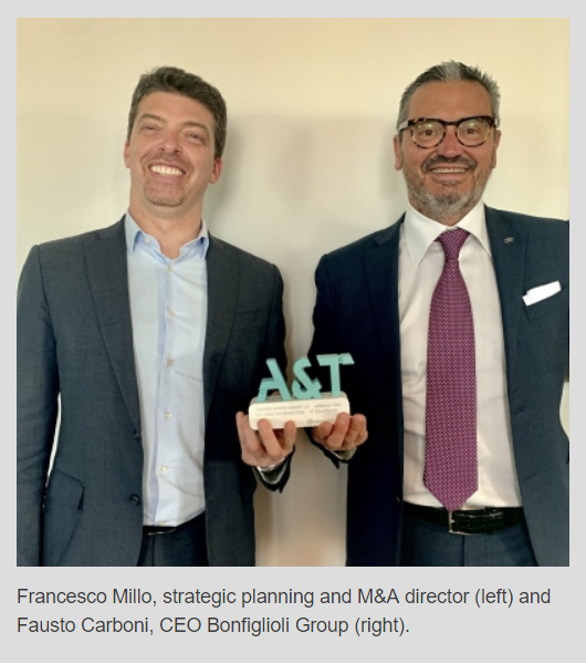The A&T (Automation & Testing) 2021 Fair in Torino recently presented Bonfiglioli Riduttori with an Innovation 4.0 award for its IoTwins project. The other winner was Rollwasch italiana S.p.a., with VibroBLAST, a patent for a revolutionary vibro-blasting technology.